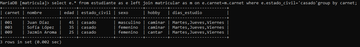 select e.* from estudiante as e left join matricular as m on e.carnet=m.carnet where e.estado_civil='casado'group by carnet;