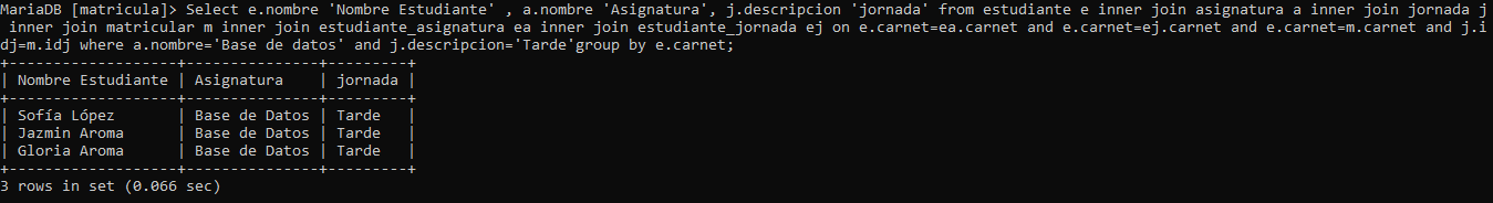Estudiantes que están matriculados en la asignatura Base de datos y que estudian en la jornada tarde